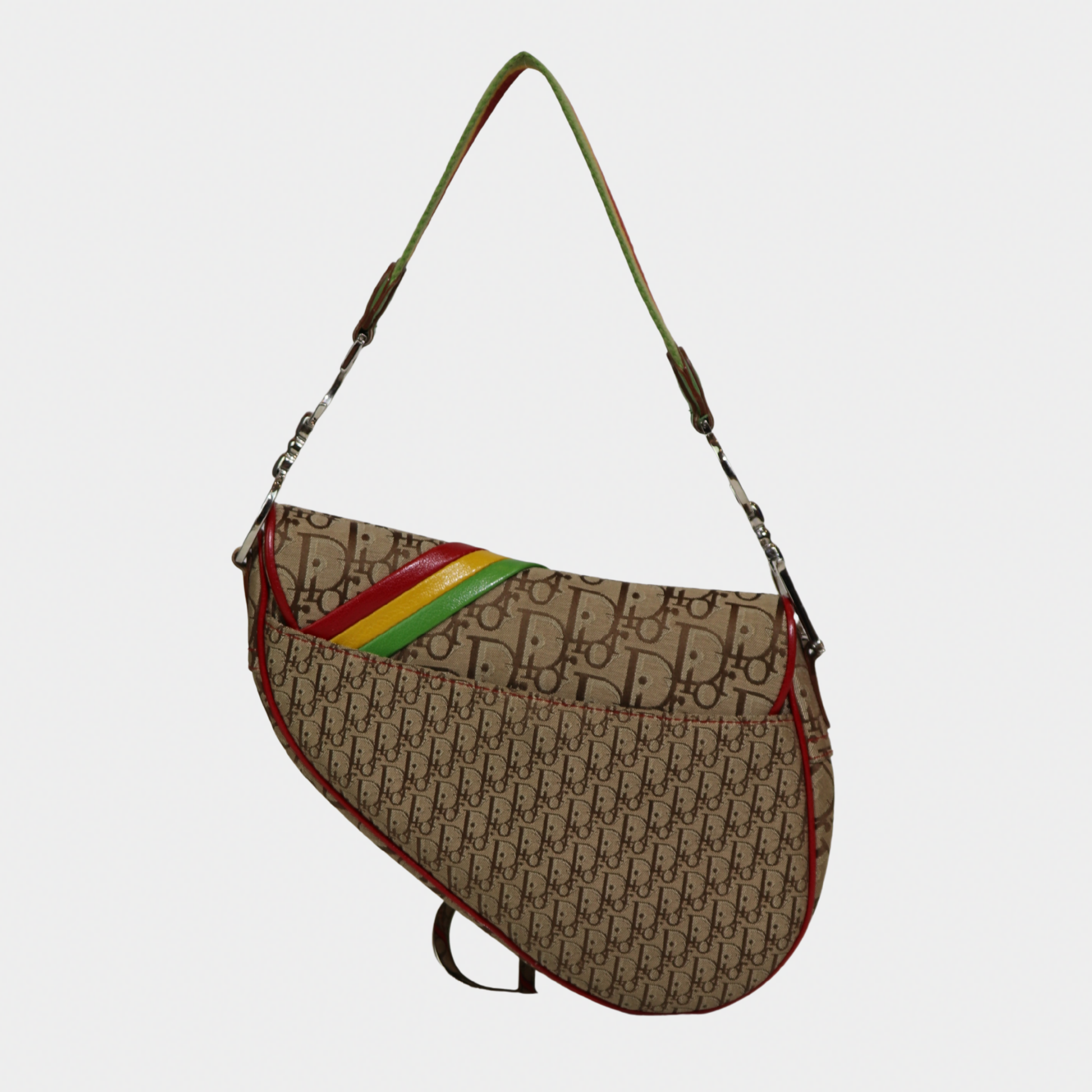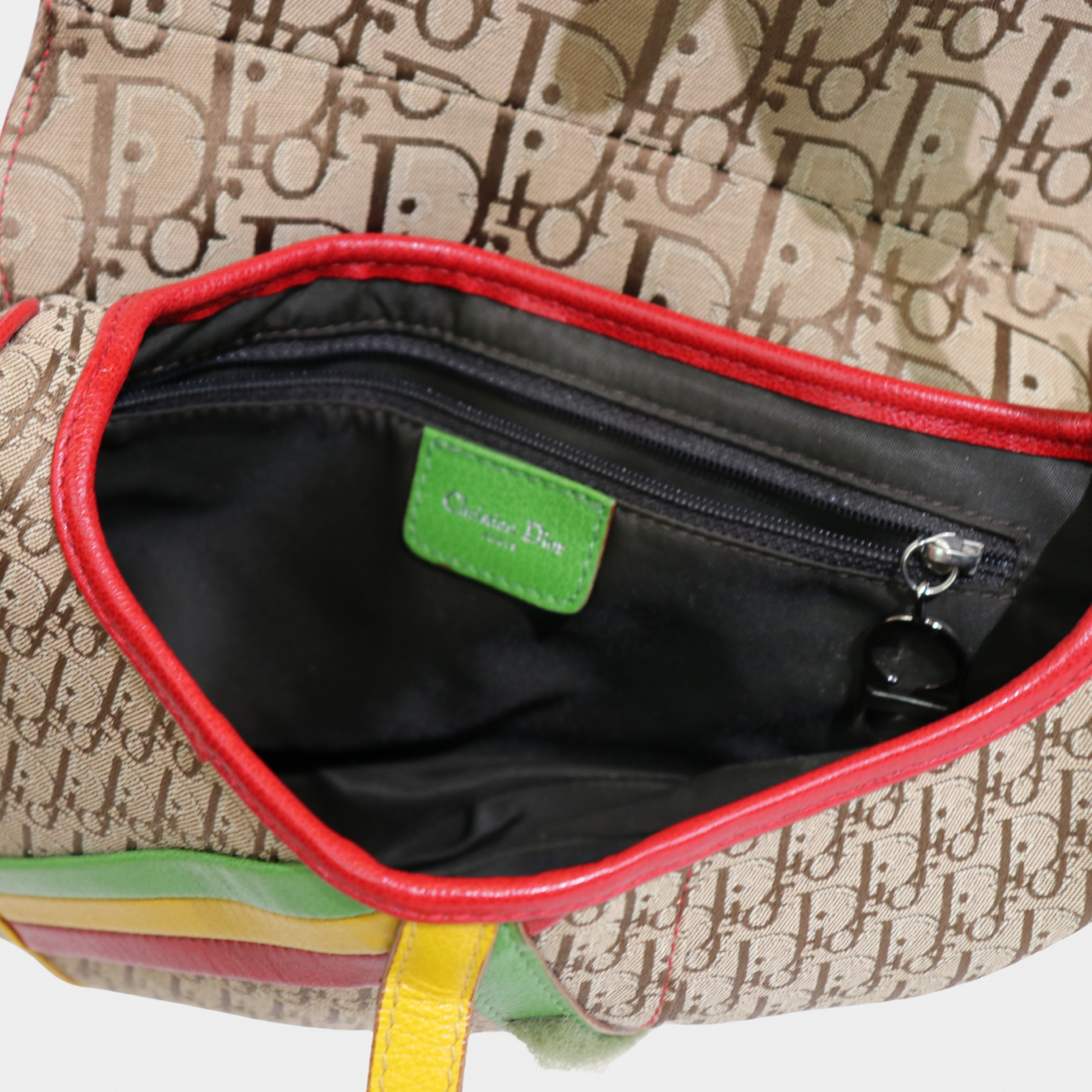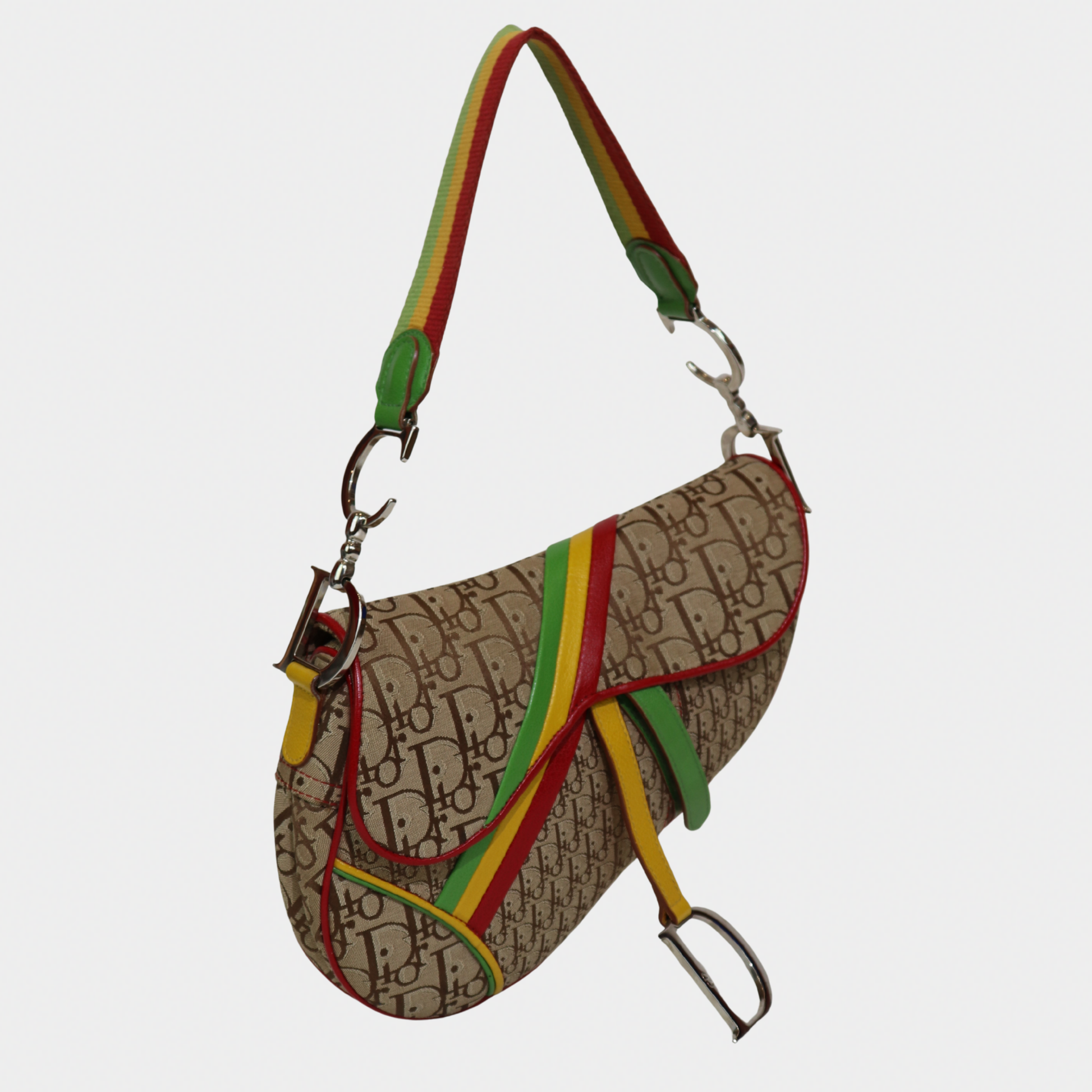 A rare find for the collector. Vintage Christian Dior Rasta Saddle Bag from the 2004 John Galliano collection is an unforgettable piece of fashion history. The bold, iconic design features a neutral-toned canvas with the signature Rasta colourway and silver-tone hardware. It includes a single shoulder strap and a handy interior pocket, making it a stylish and practical choice for daily essentials. A quintessential piece that perfectly captures the spirit of early 2000s charm.