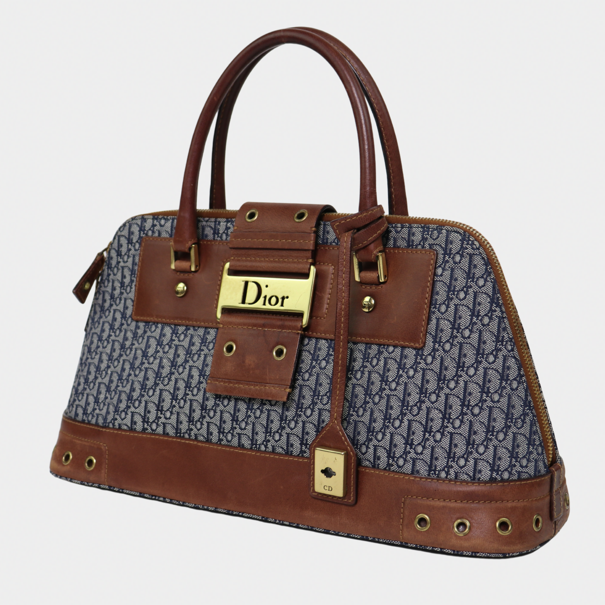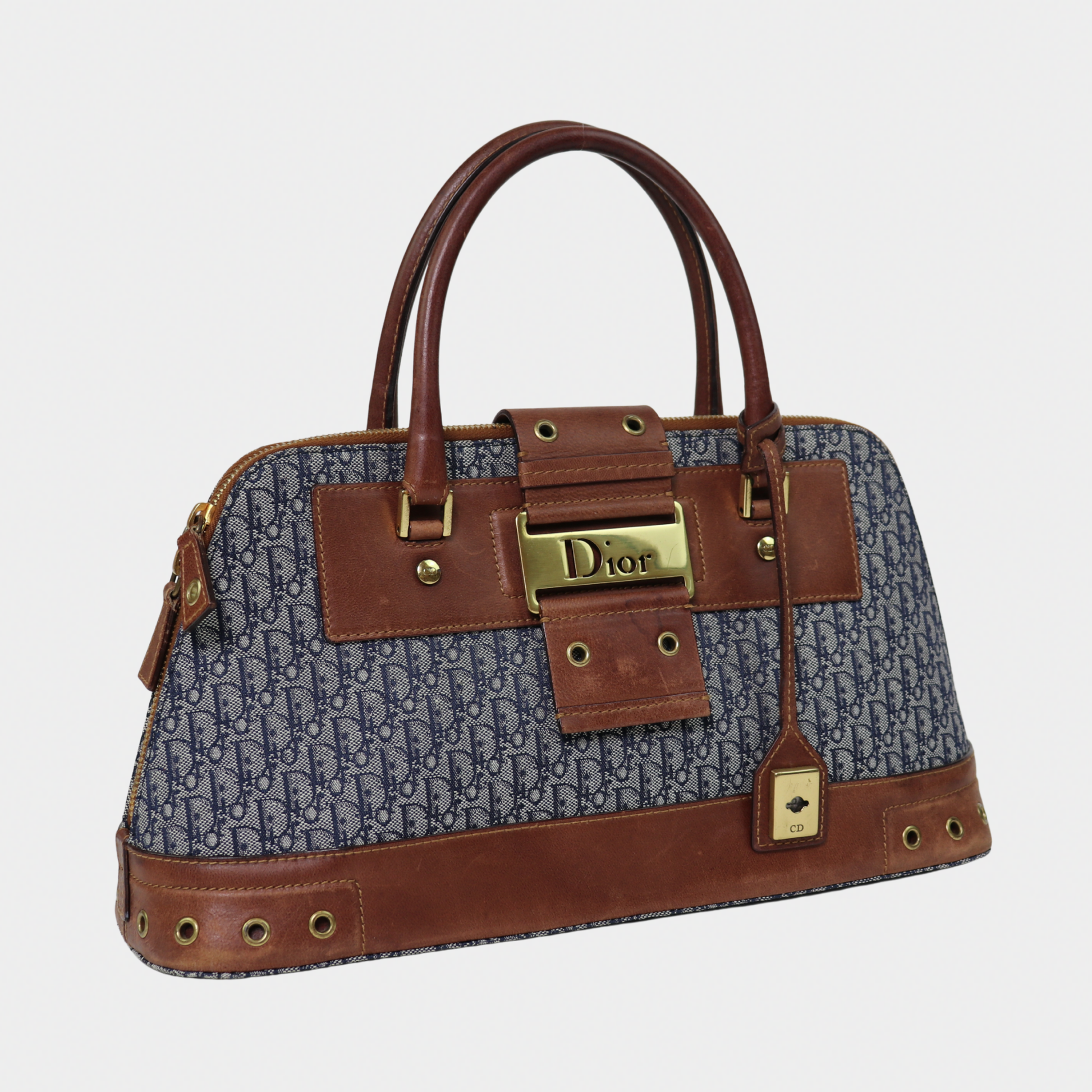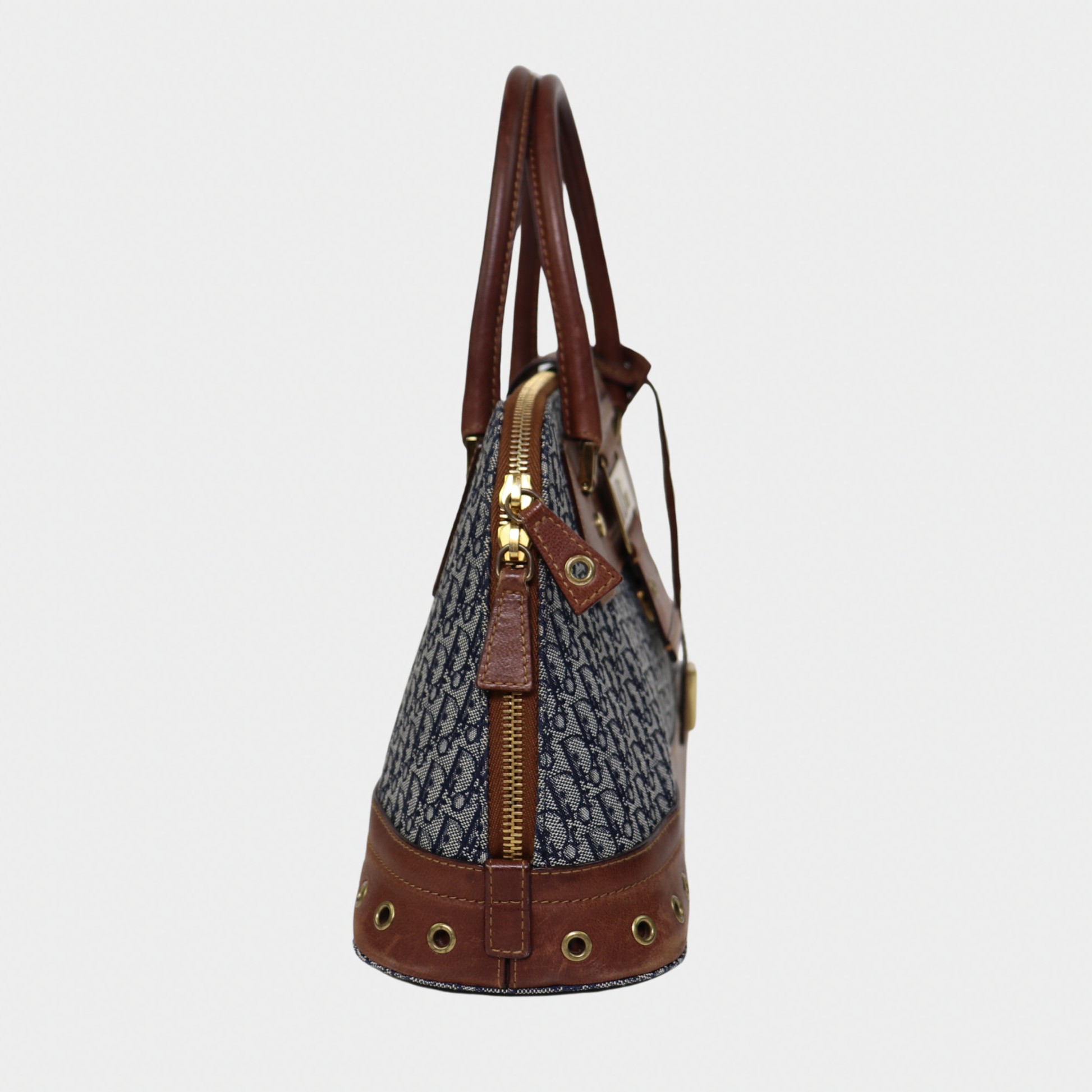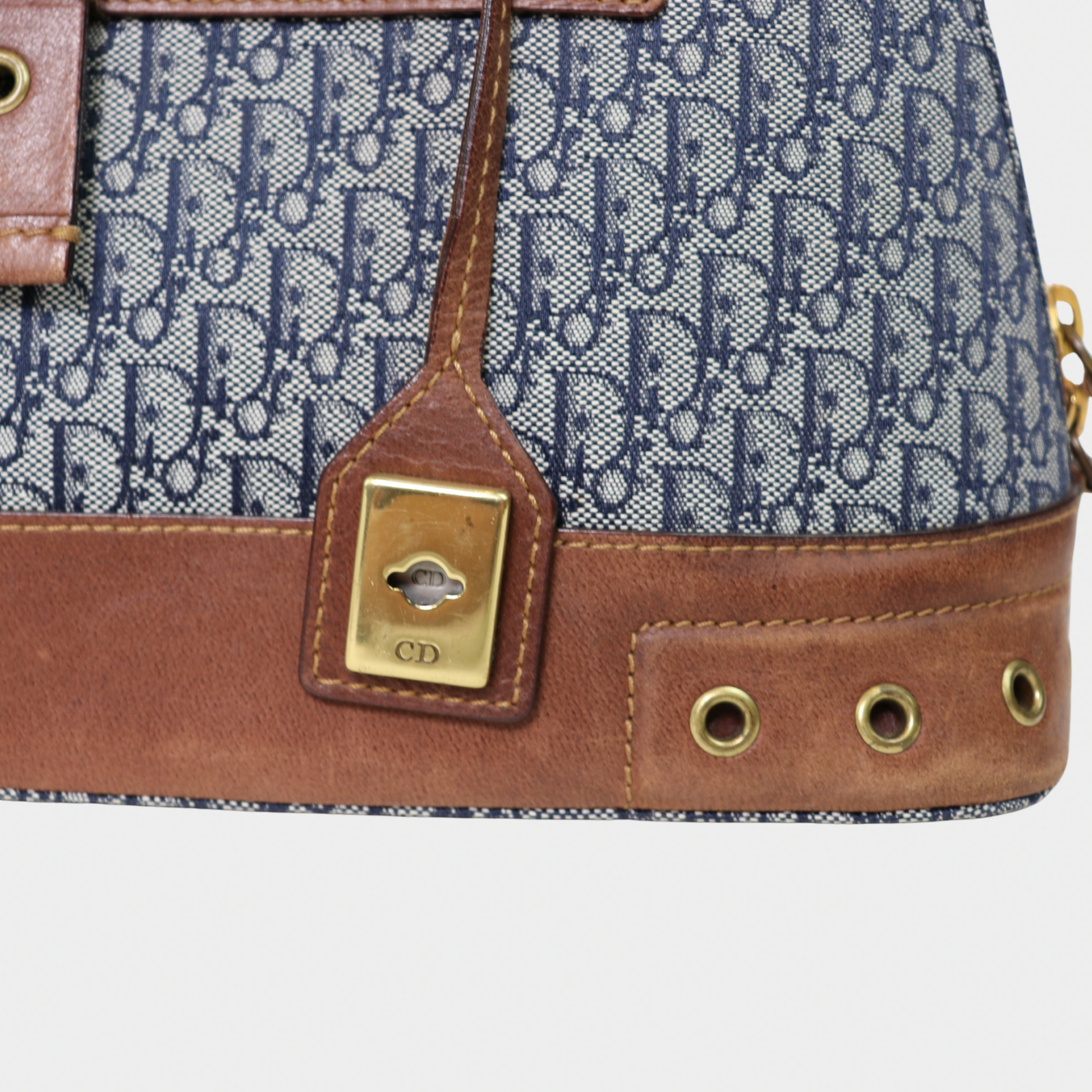 Christian Dior Trotter Top Handle Bag from the 2002 John Galliano era, quintessential early-2000s statement piece. Crafted in navy canvas with the iconic Dior Oblique monogram pattern, gold-tone hardware, rolled top handles, and a zip closure at the top. The interior is lined in nylon with a single pocket, making it both stylish and functional. A true vintage Dior Galliano collectible.