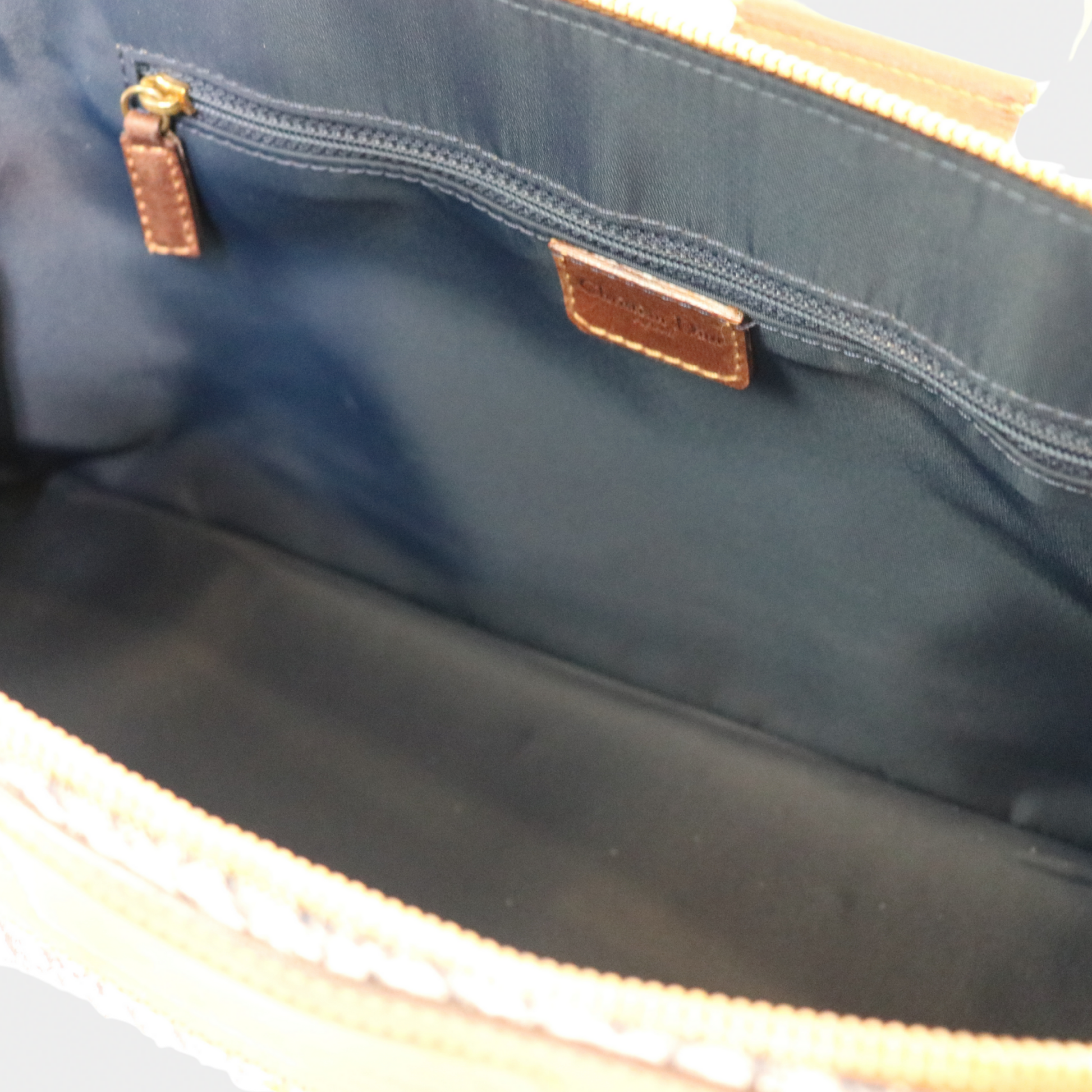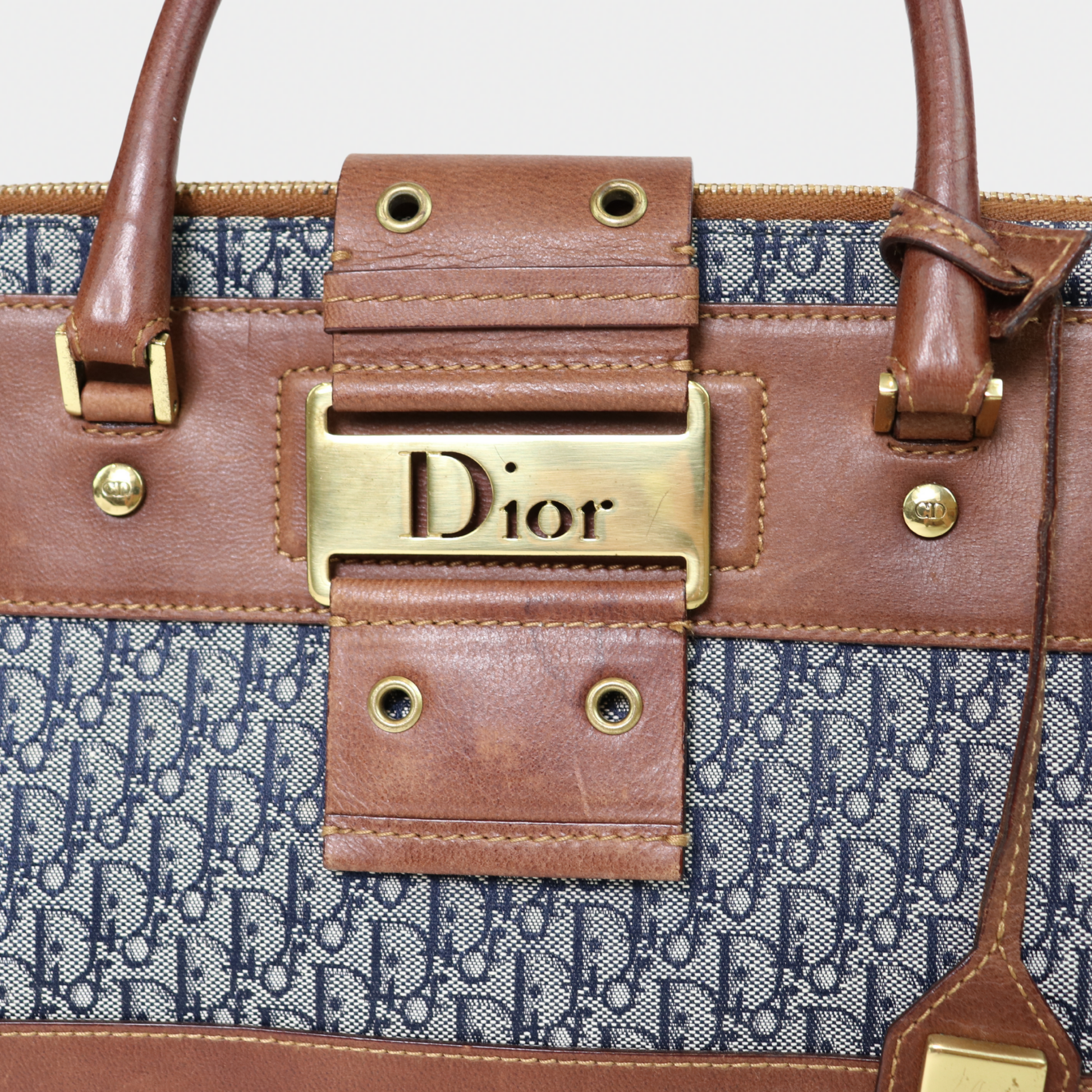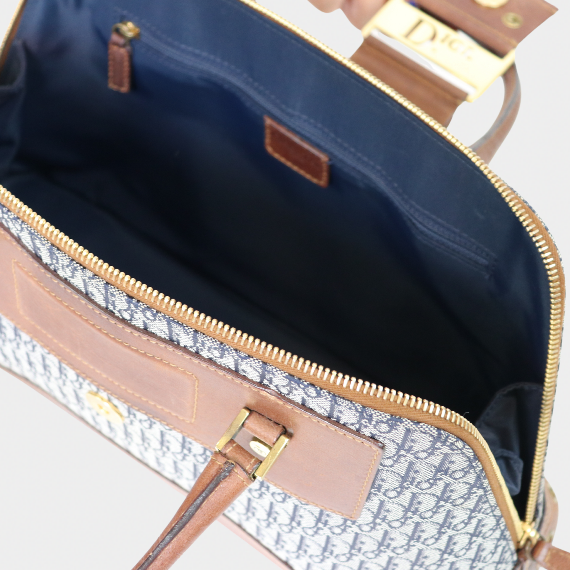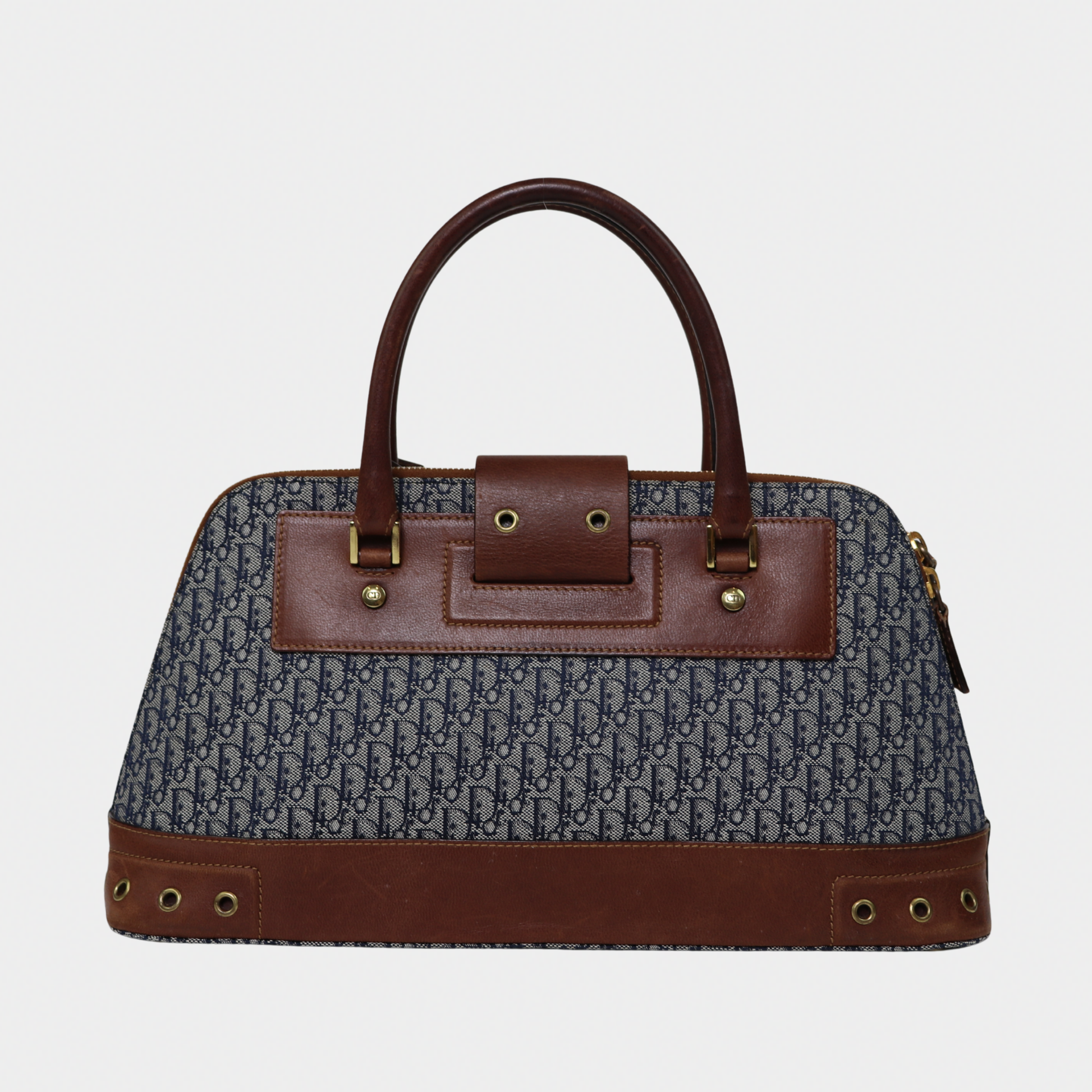 Christian Dior Trotter Top Handle Bag from the 2002 John Galliano era, quintessential early-2000s statement piece. Crafted in navy canvas with the iconic Dior Oblique monogram pattern, gold-tone hardware, rolled top handles, and a zip closure at the top. The interior is lined in nylon with a single pocket, making it both stylish and functional. A true vintage Dior Galliano collectible.