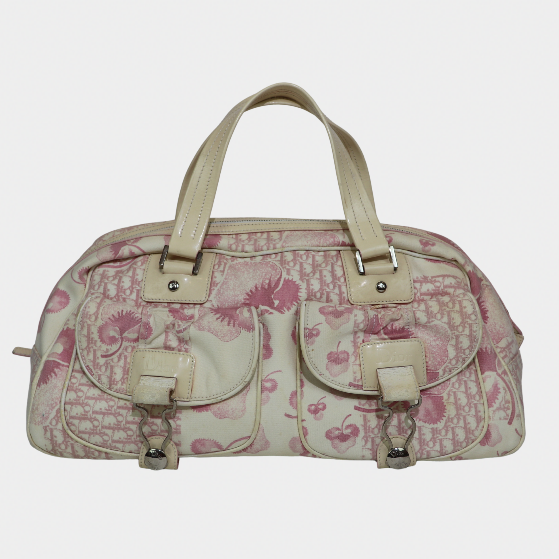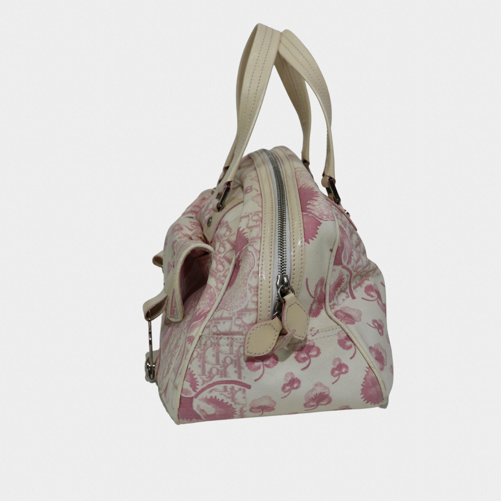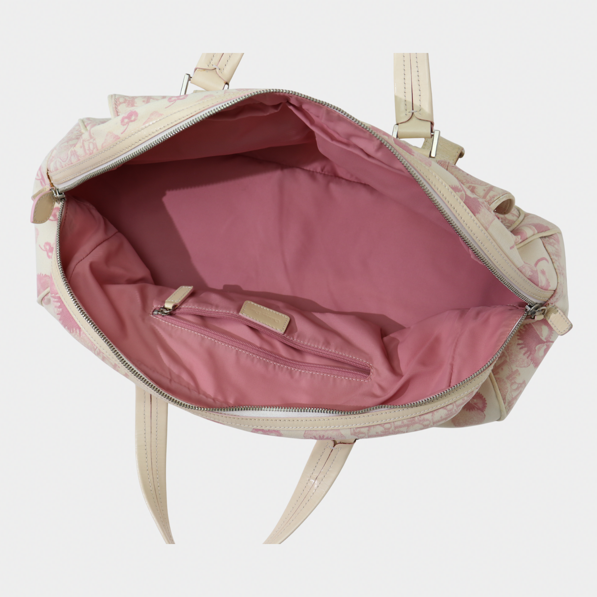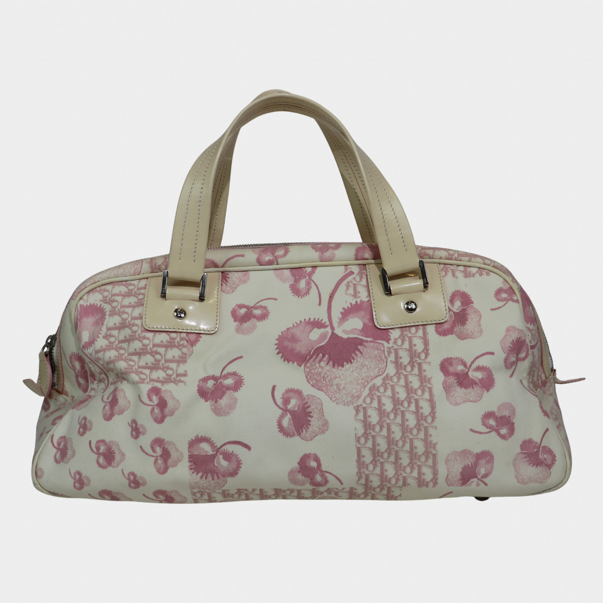 A larger take on a coveted classic. Vintage Dior bowler bag from the 2004 John Galliano era is the spacious counterpart to our mini bowler. Crafted in a pink printed canvas with structured handles and silver-tone hardware, it's the perfect everyday bag with more room for your essentials. It features a zip closure, a handy exterior pocket, and a nylon-lined interior with two inner pockets. Protective feet at the base ensure durability, making it both practical and a stylish statement.
