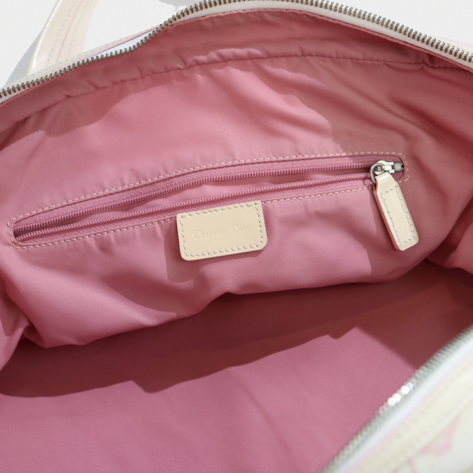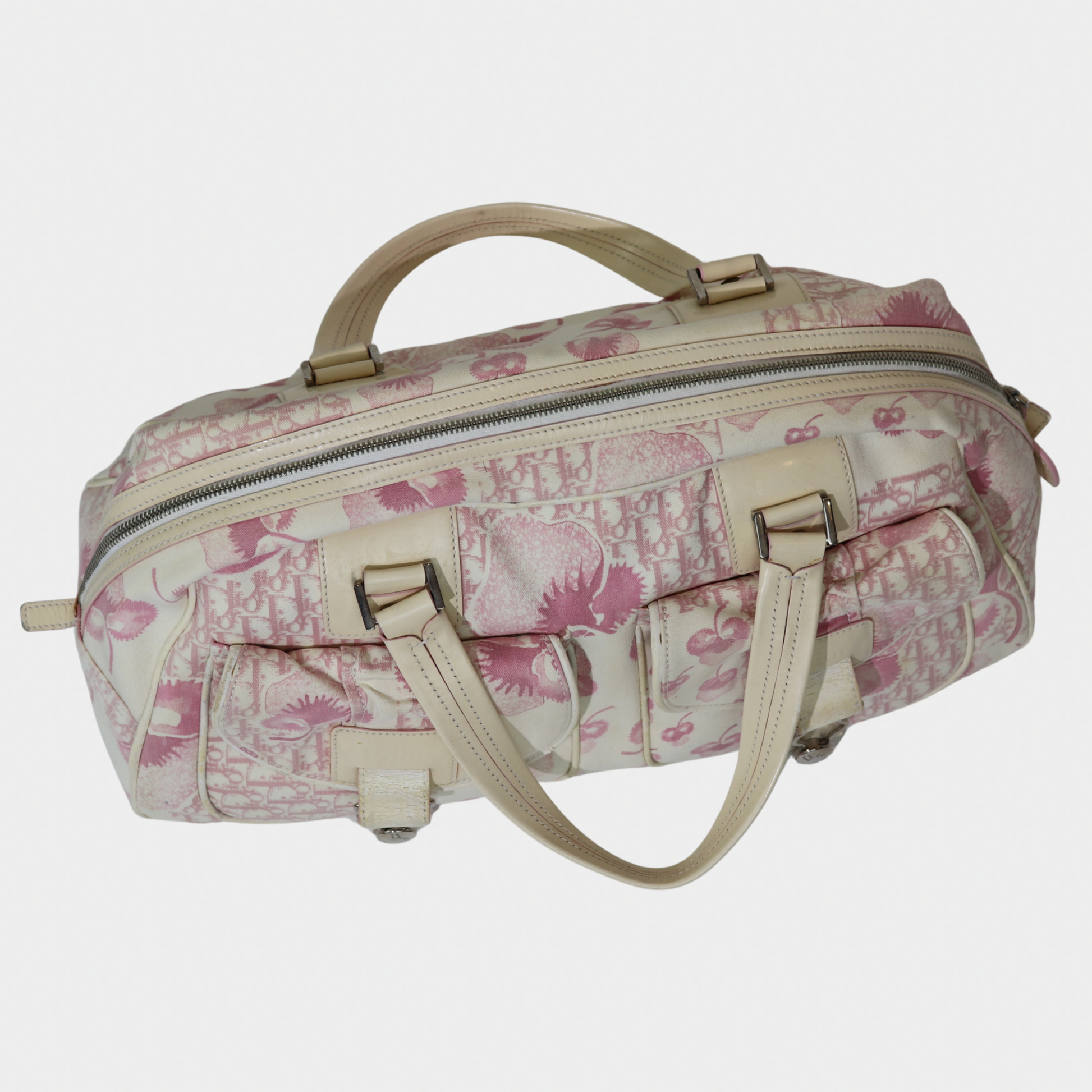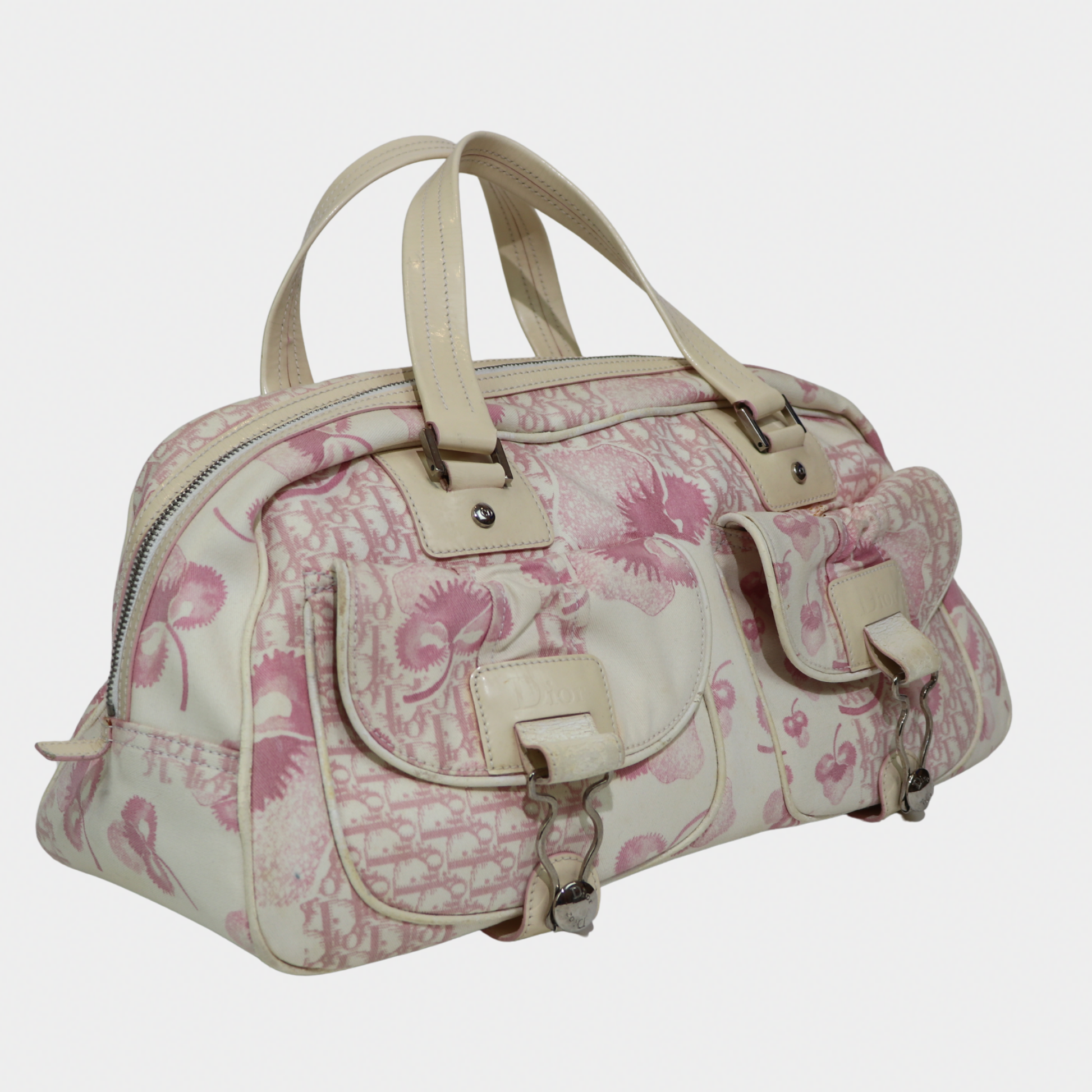 A larger take on a coveted classic. Vintage Dior bowler bag from the 2004 John Galliano era is the spacious counterpart to our mini bowler. Crafted in a pink printed canvas with structured handles and silver-tone hardware, it's the perfect everyday bag with more room for your essentials. It features a zip closure, a handy exterior pocket, and a nylon-lined interior with two inner pockets. Protective feet at the base ensure durability, making it both practical and a stylish statement.