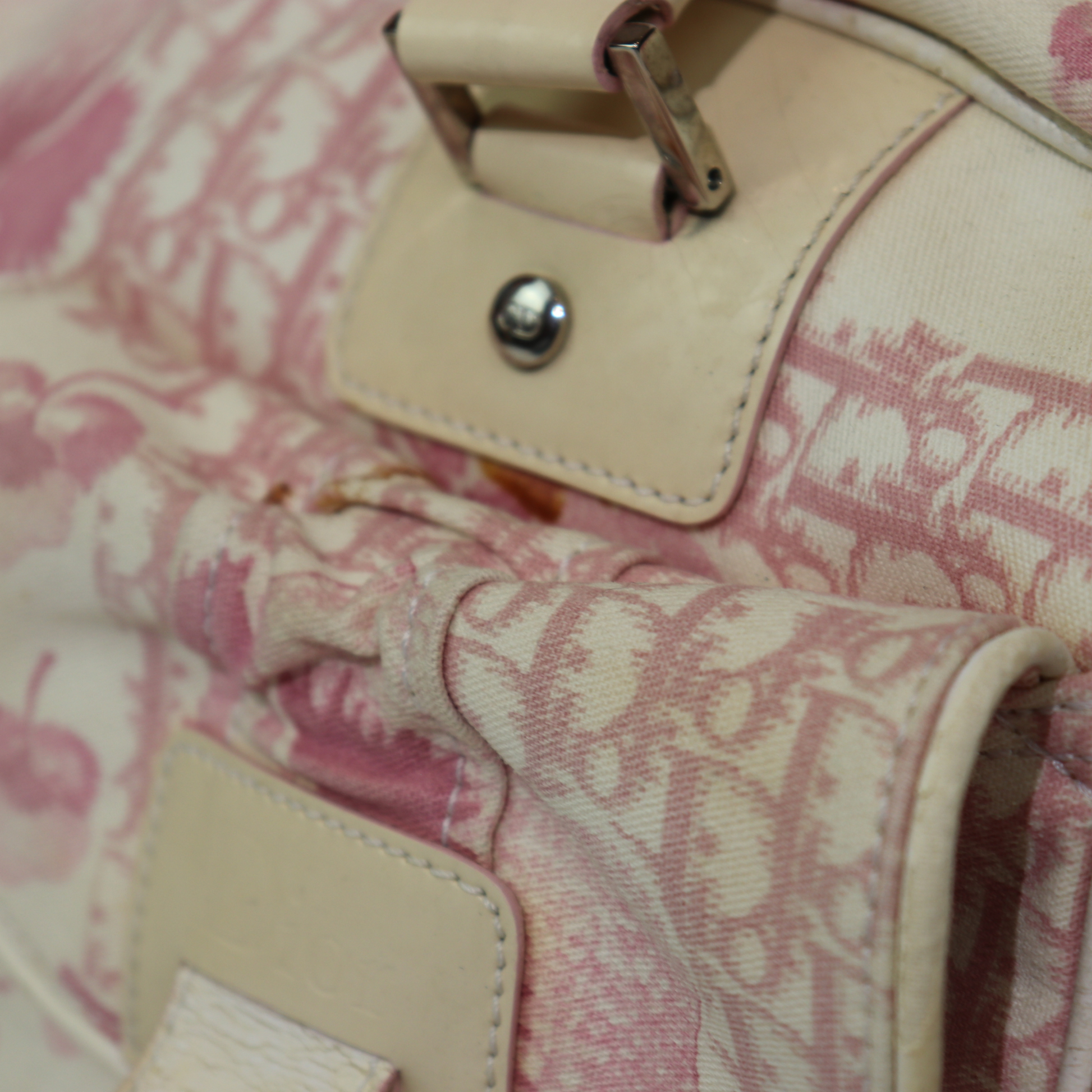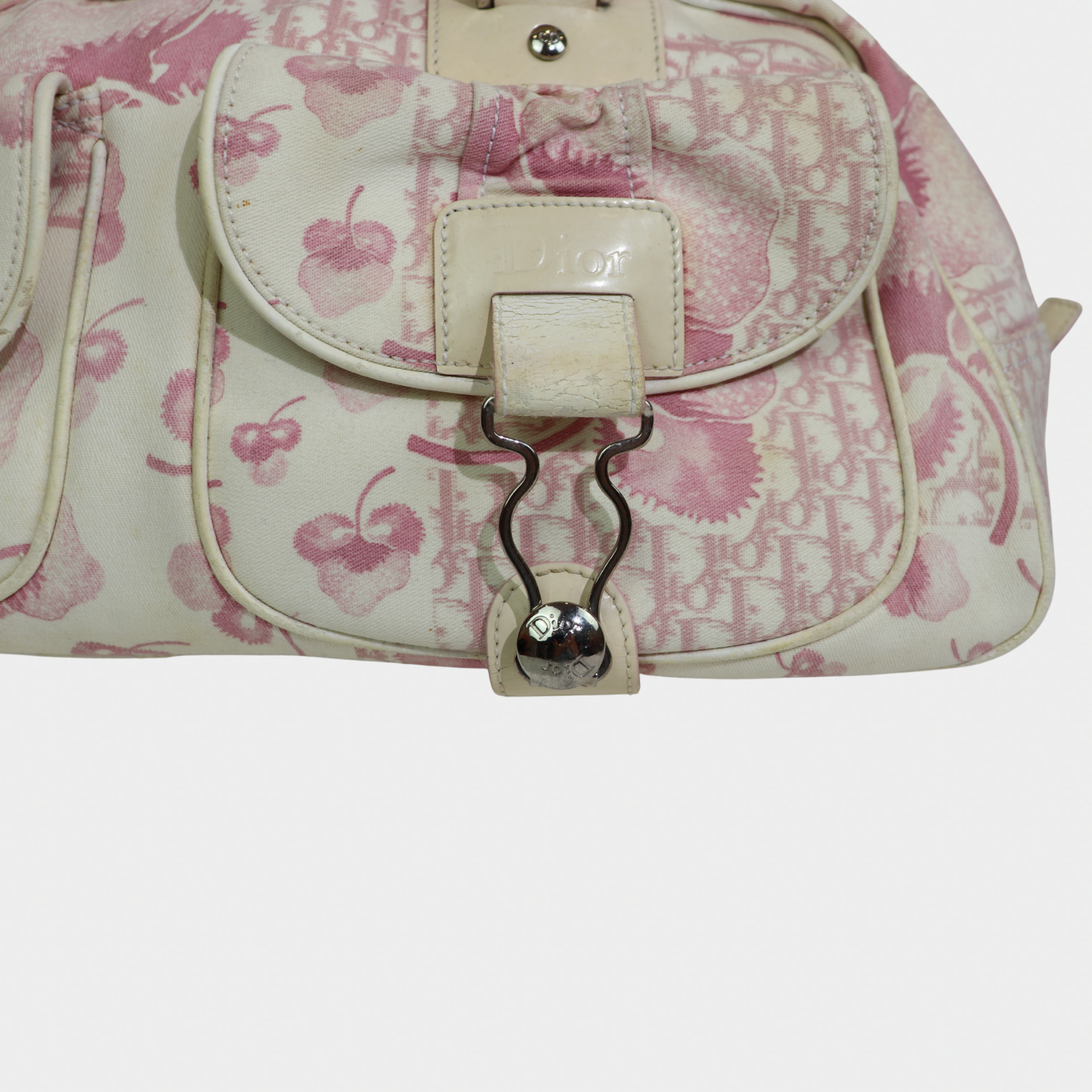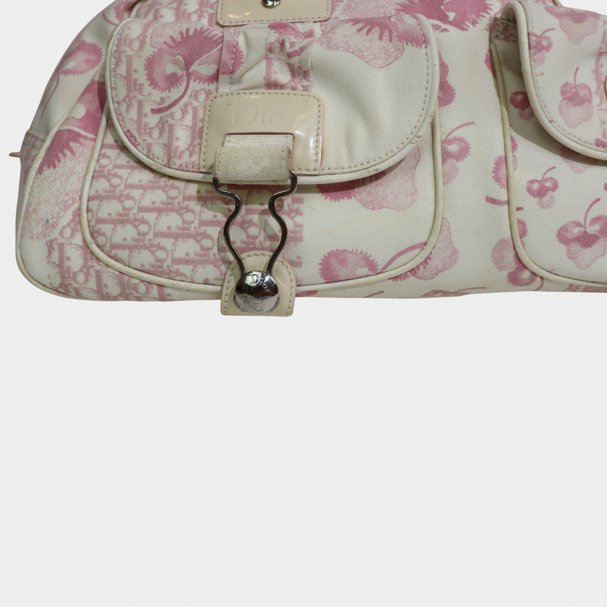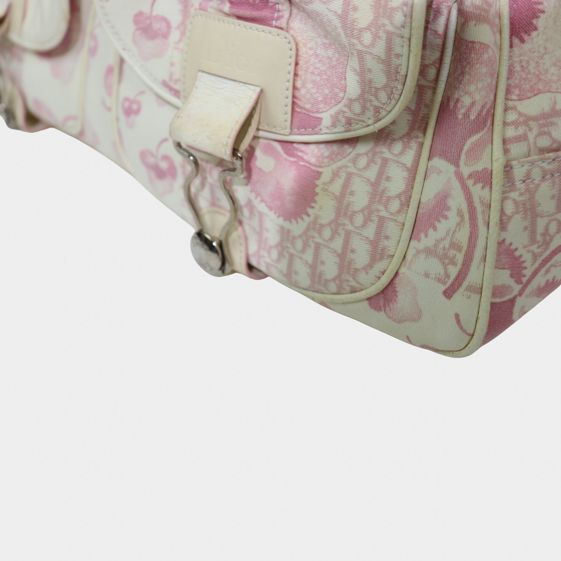 A larger take on a coveted classic. Vintage Dior bowler bag from the 2004 John Galliano era is the spacious counterpart to our mini bowler. Crafted in a pink printed canvas with structured handles and silver-tone hardware, it's the perfect everyday bag with more room for your essentials. It features a zip closure, a handy exterior pocket, and a nylon-lined interior with two inner pockets. Protective feet at the base ensure durability, making it both practical and a stylish statement.