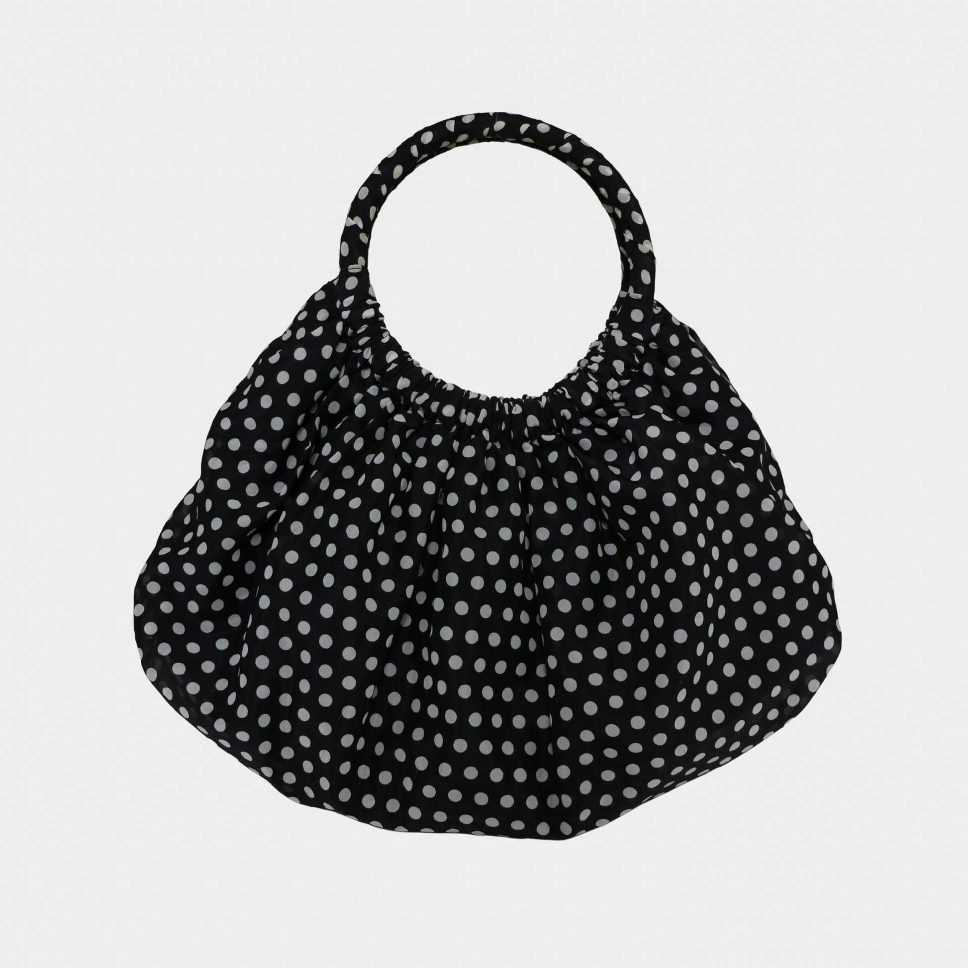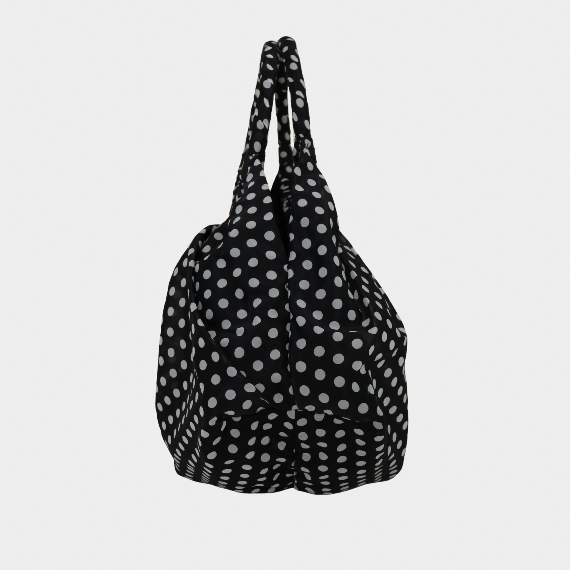 A little polka-dot perfection! Make a subtle statement with this CDG Junya Watanabe tote, crafted in polka dot chiffon for a playful yet sophisticated look. Easy-to-wear silhouette with structured circular handles that fit comfortably over the shoulder. Big enough for your laptop or an ipad and includes one interior zip pocket to keep the essentials organized. The perfect finishing touch to any look.