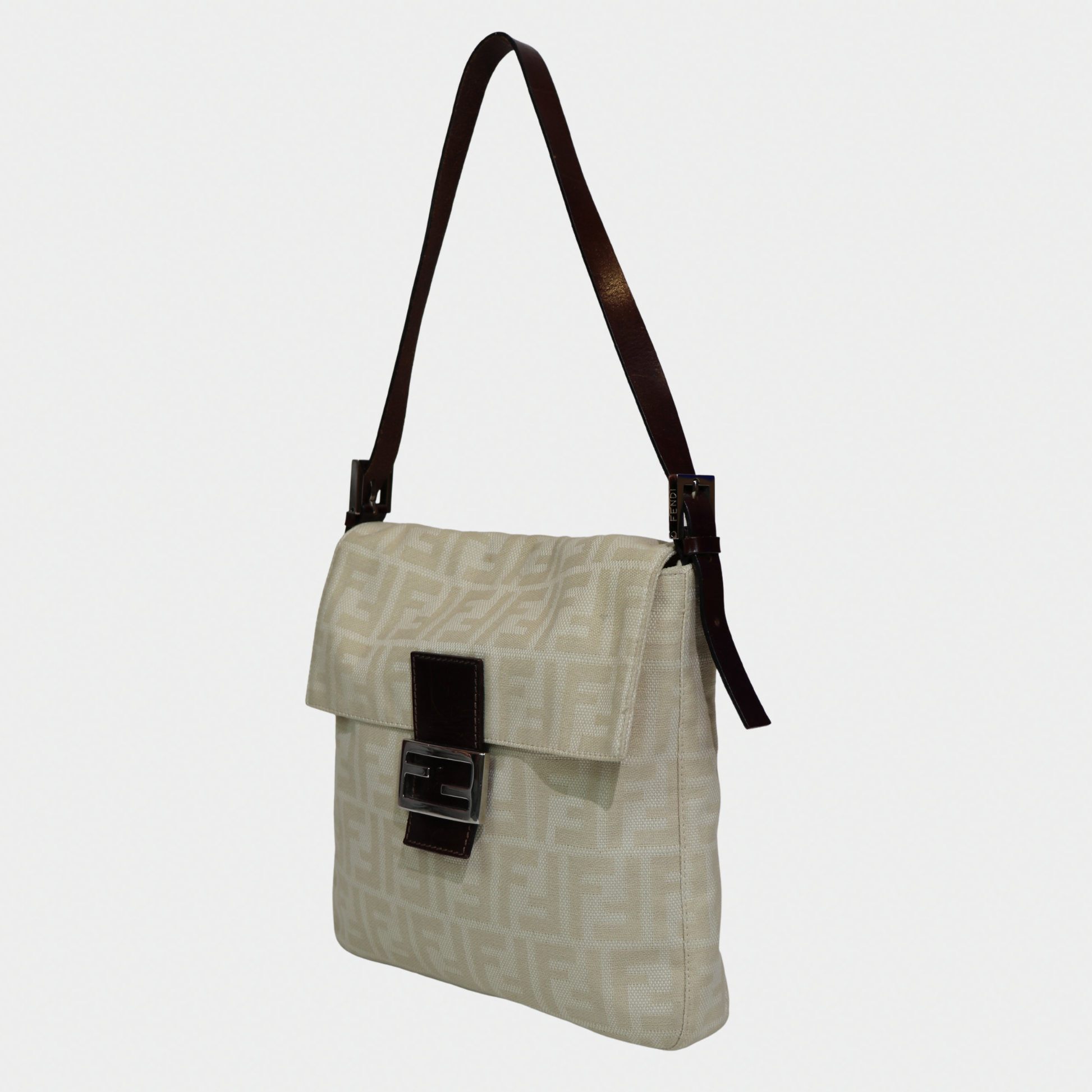 A timeless icon for the modern wardrobe. This vintage Fendi Zucca Mamma Bag from the 2000s is a true classic. Crafted in a chic beige canvas with the iconic Zucca print and finished with sleek silver-tone hardware, it's the perfect everyday shoulder bag. It features a comfortable flat leather strap and an interior zip pocket, making it a versatile go-to for any occasion.