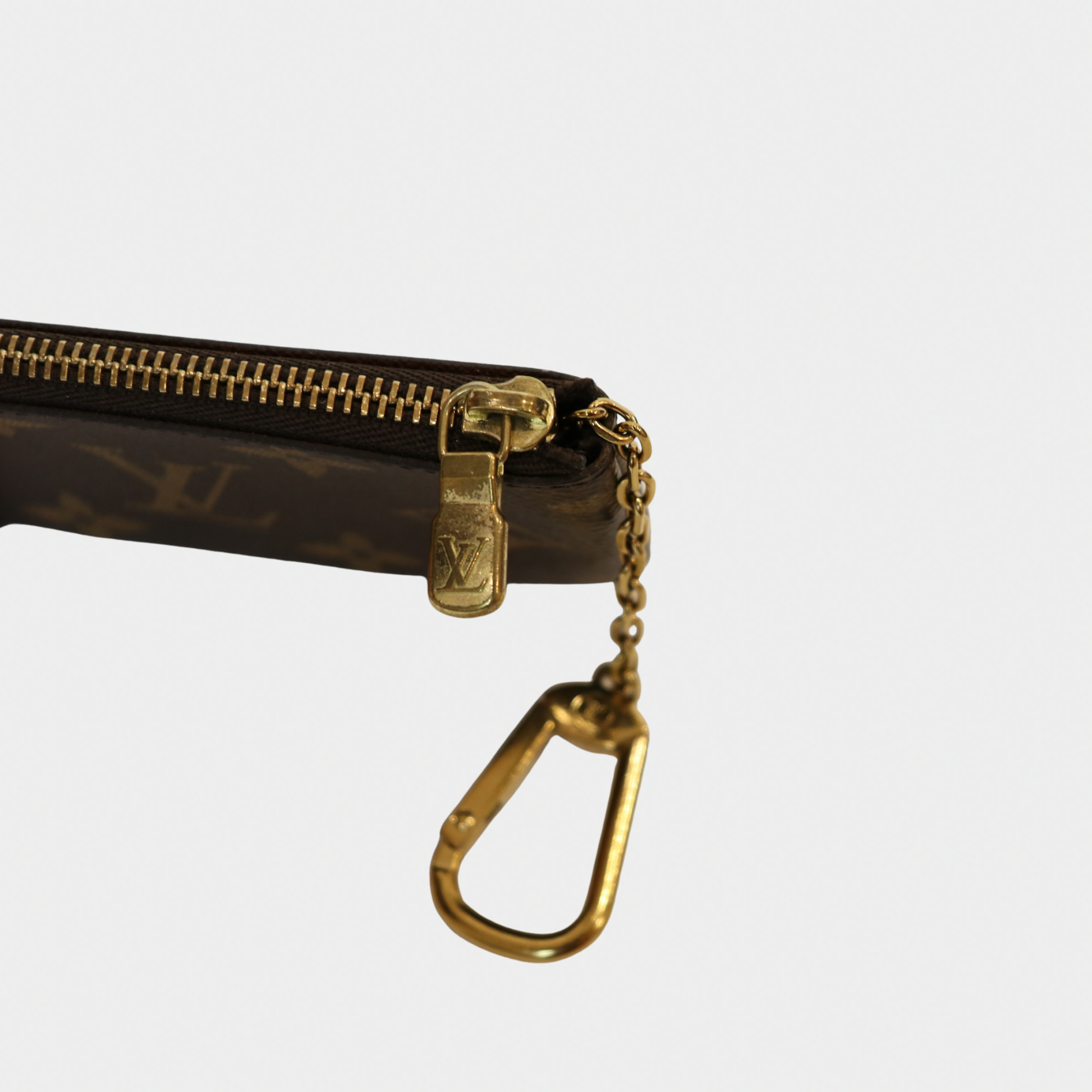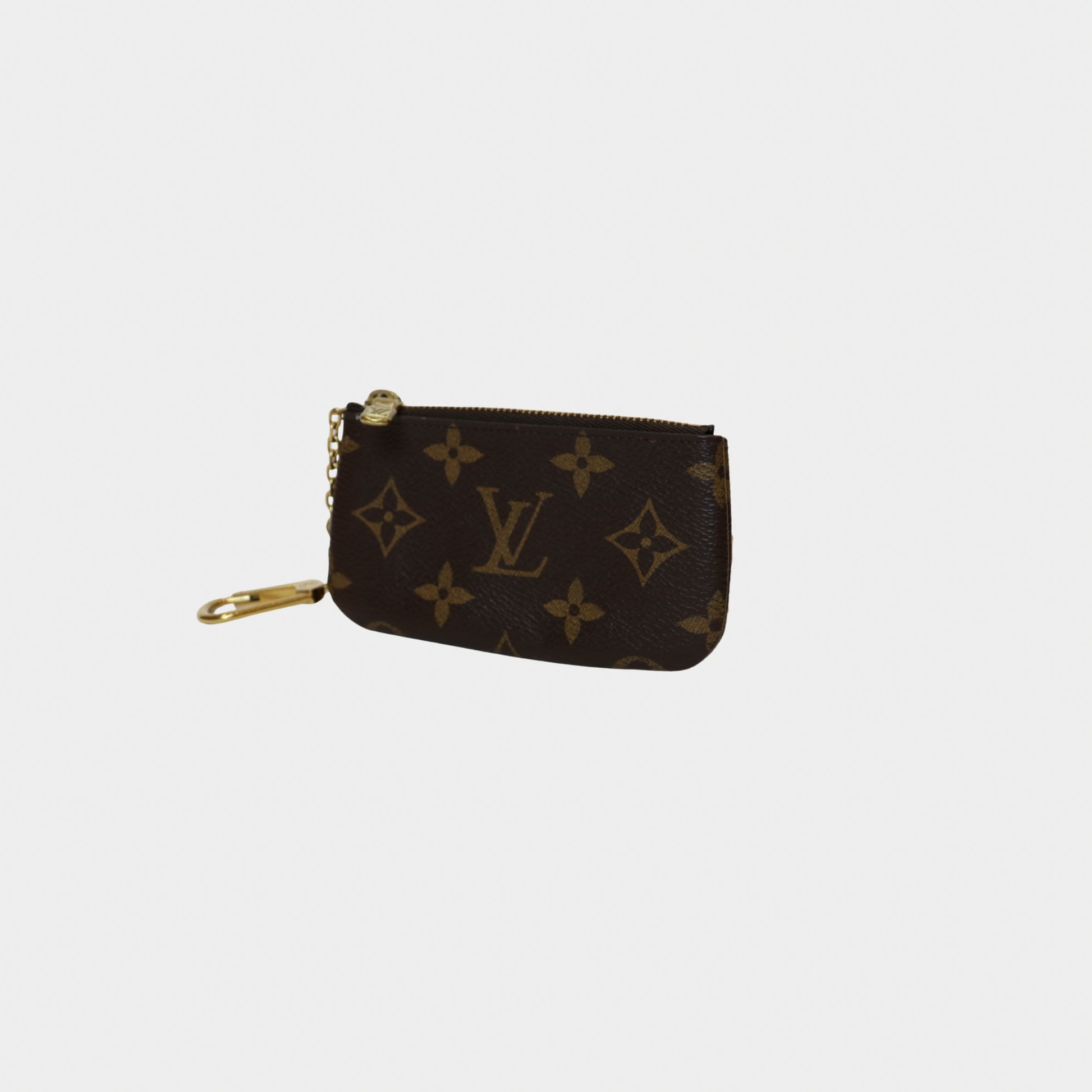 Small but iconic. This LV key pouch is crafted from the classic LV monogram coated canvas with a zip closure that opens to a leather interior. Inside, there’s an attached carabiner that clips to your keys or bag.