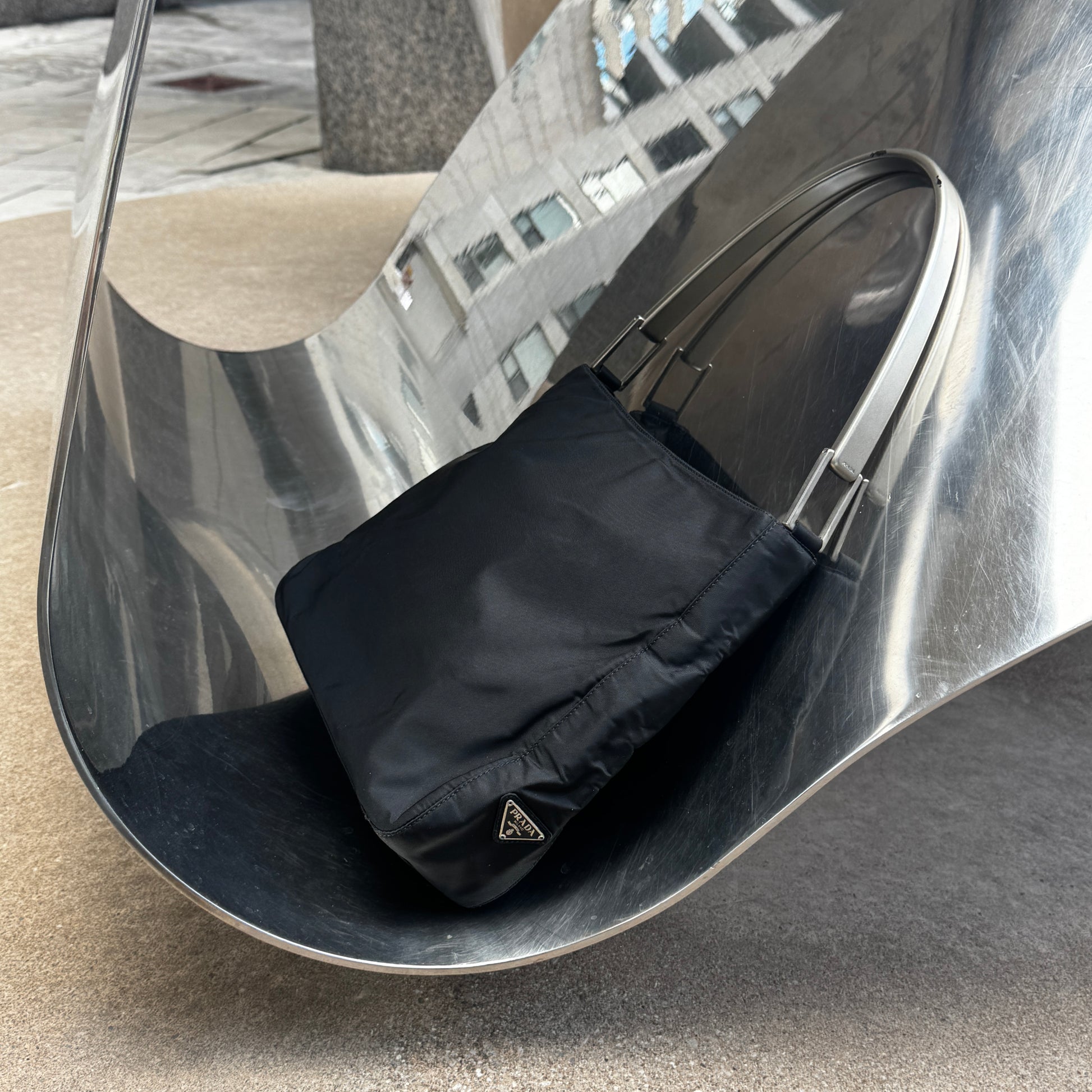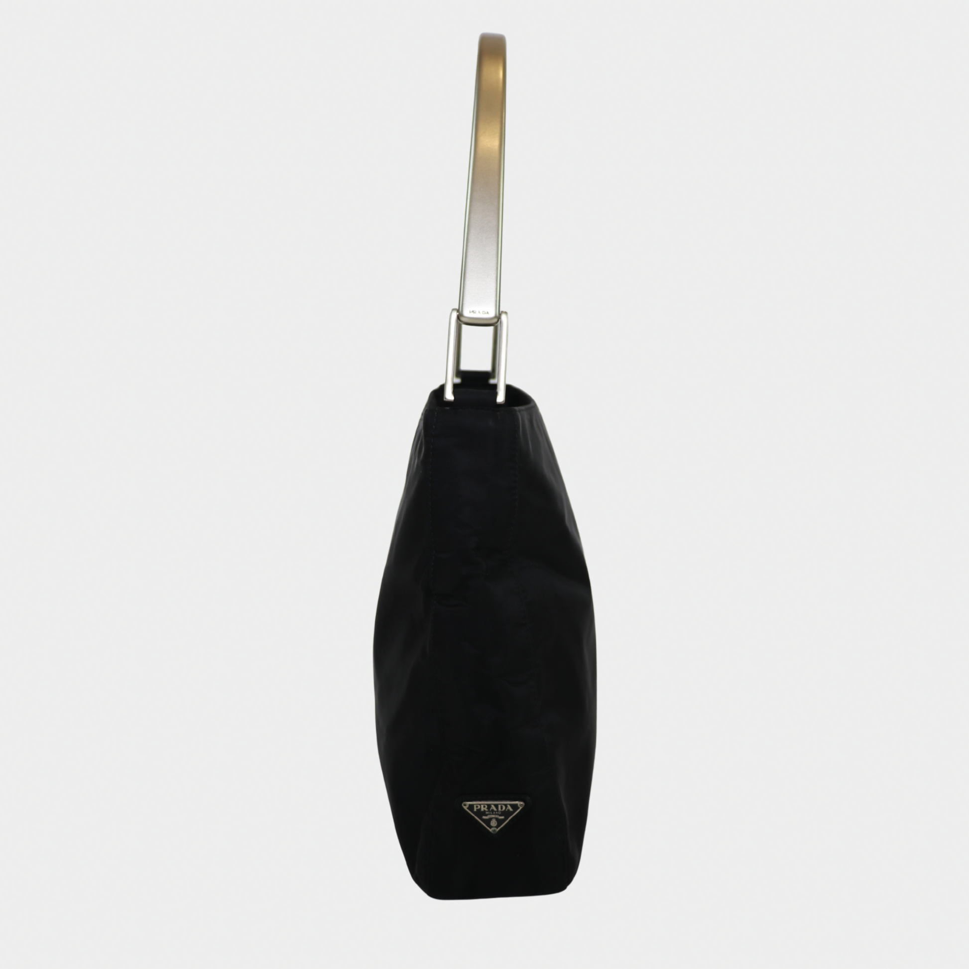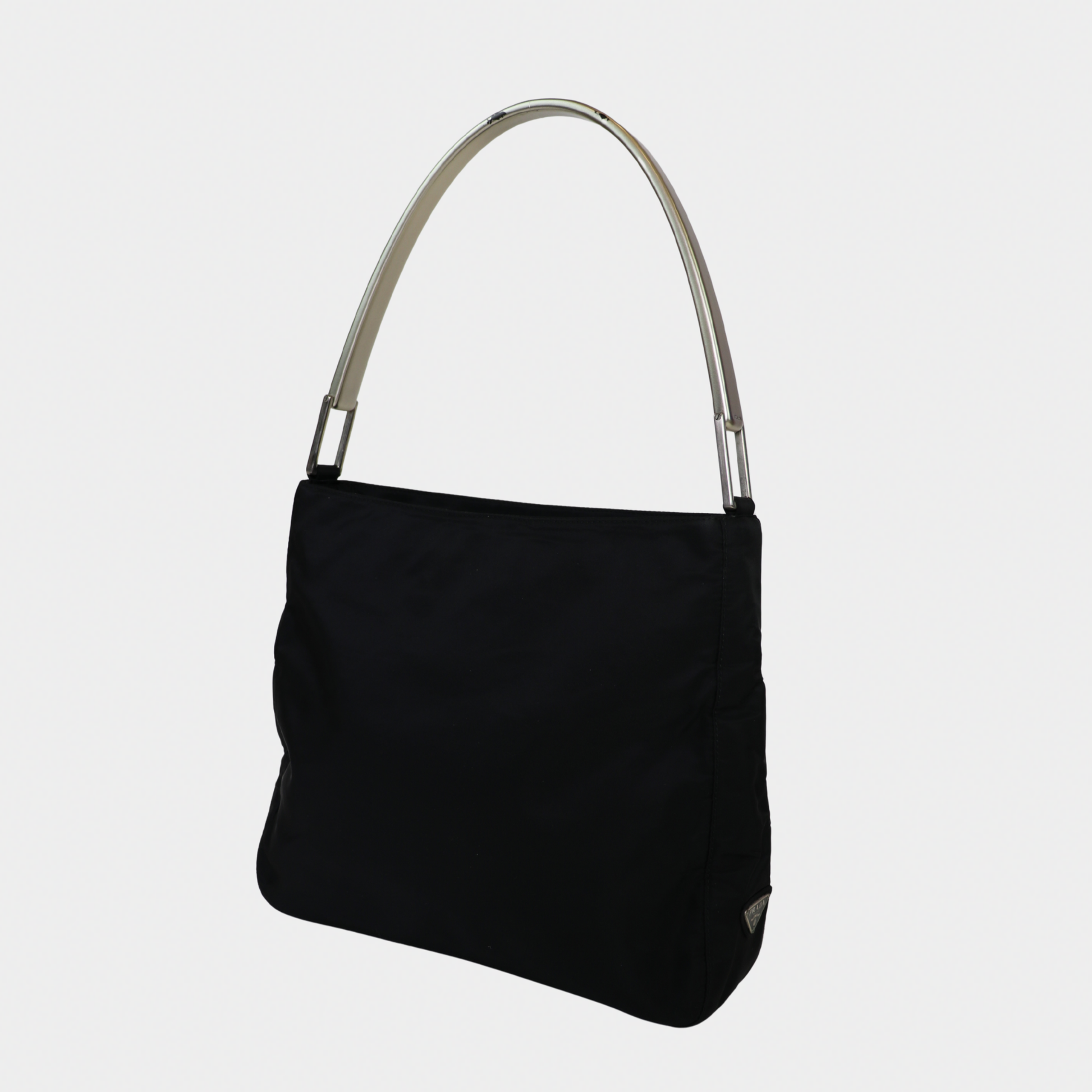 Sleek and sophisticated. Prada Nylon shoulder bag with a unique, silver-tone curved handle and the iconic enameled metal triangle logo. Designed with an open-top silhouette, features the logo jacquard lining with two interior pockets, one to hold your essentials and one central divider pocket.