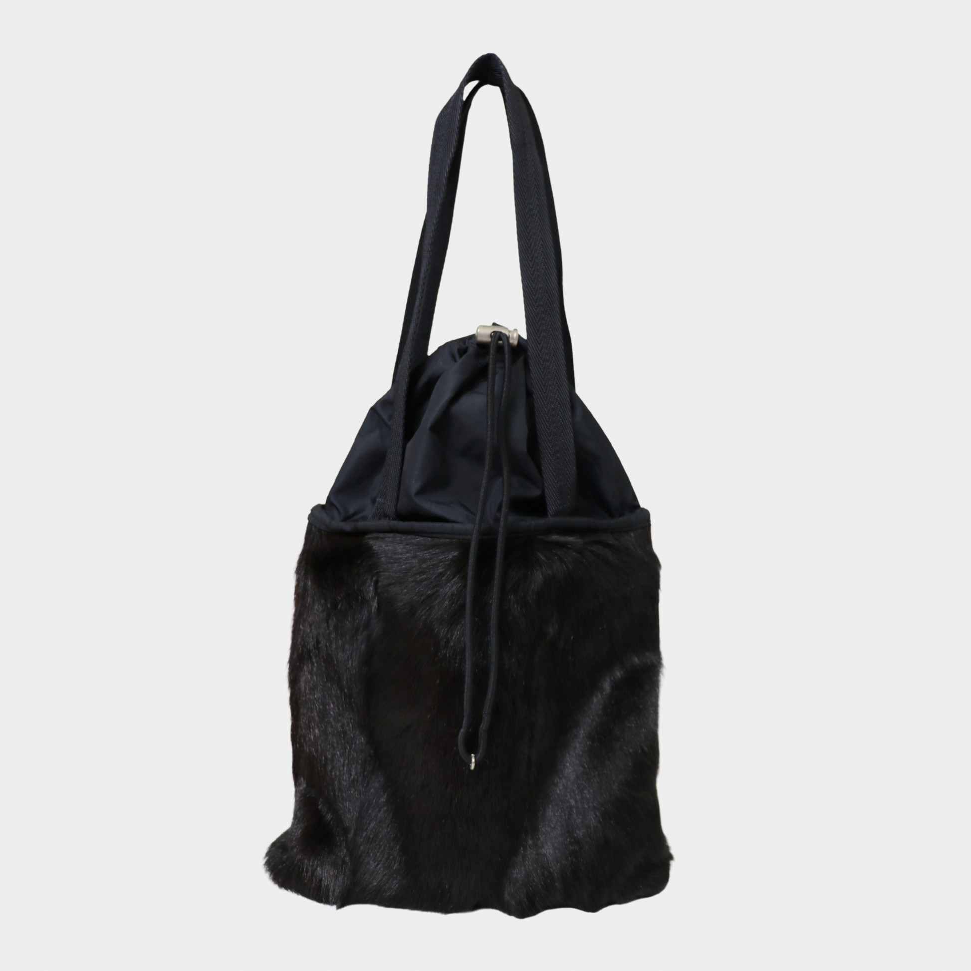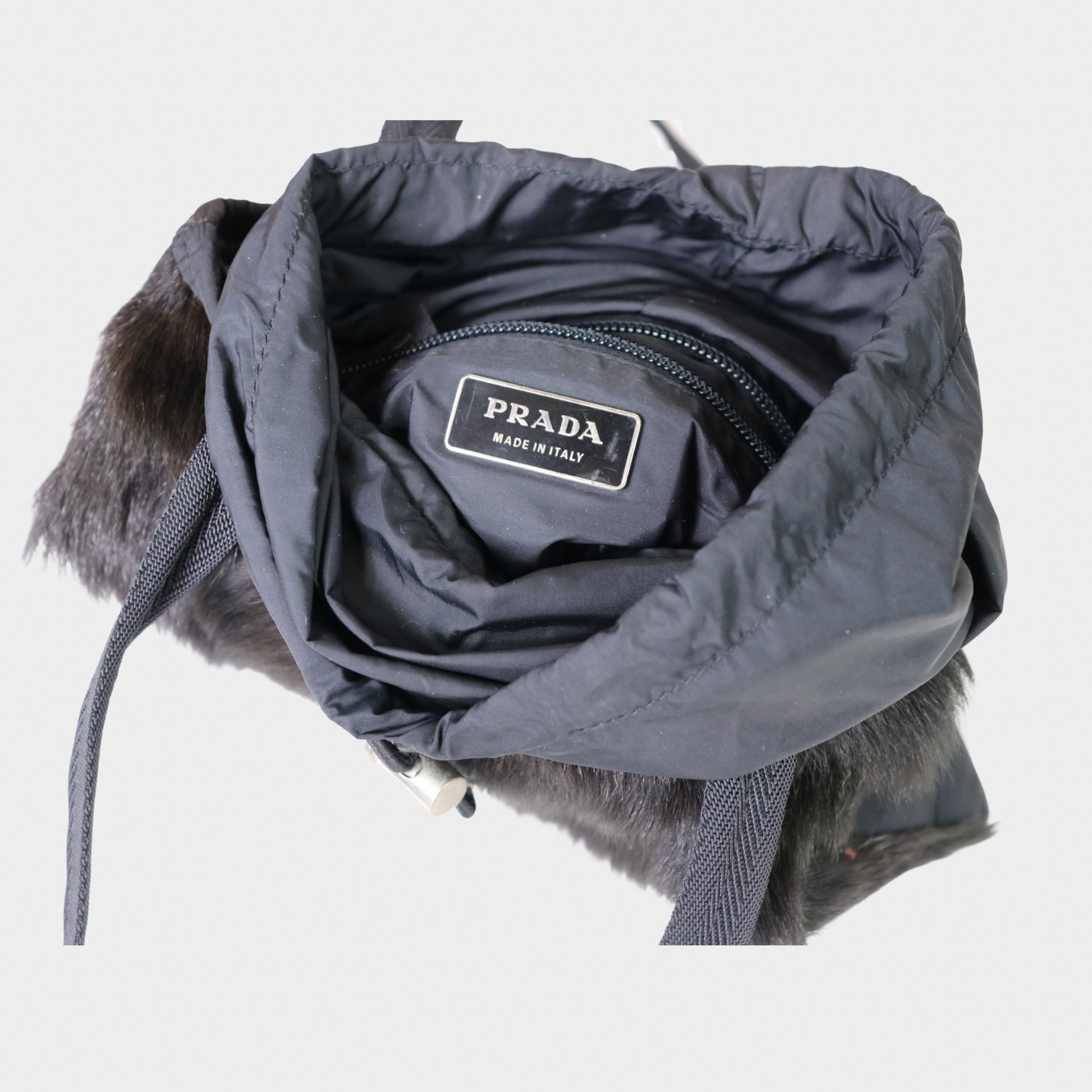 A true statement piece from the Prada F/W 1999 collection. This iconic tote features a bold fur and nylon body, a drawstring top, and flat shoulder straps for easy carrying. It's the perfect après-ski bag, with a sporty feel that's ideal for a cozy, chic look. The best part? The drawstring closure can be left open, creating space to easily fit a water bottle.
